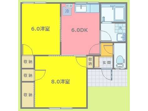 | 詳細間取 | 2DK (洋8帖×1、洋6帖×1、DK6帖) | ||